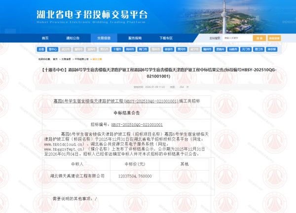 查看更多 +项目名称:嘉园6号学生宿舍楼临天津路护坡工程招标编码:HBSY-202510QG-021001001招 标 人:湖北工业职业技术学院相关网络截图:相关网络链接:嘉园6号学生宿舍楼临天津路护坡工程中标结果公告
