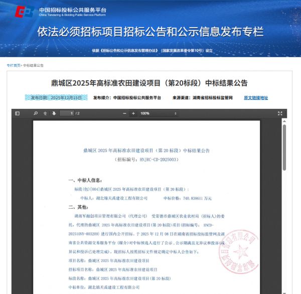项目名称:鼎城区2025年高标准农田建设项目招标编码:HNCD-202510NY-003209招 标 人:常德市鼎城区农业农村局相关网络截图:相关网络链接:鼎城区2025年高标准农田建设项目(第20标段)中标结果公告