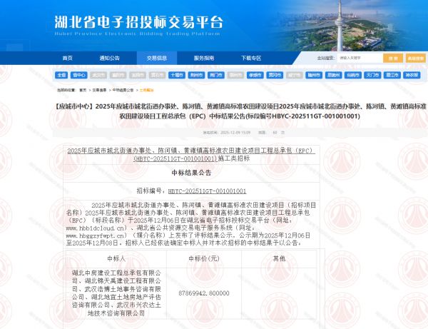项目名称:2025年应城市城北街道办事处、陈河镇、黄滩镇高标准农田建设项目工程总承包(EPC)(联合体2)招标编码:HBYC-202511GT-001001001招 标 人:应城市农业农村局相关网络截图:相关网络链接:2025年应城市城北街