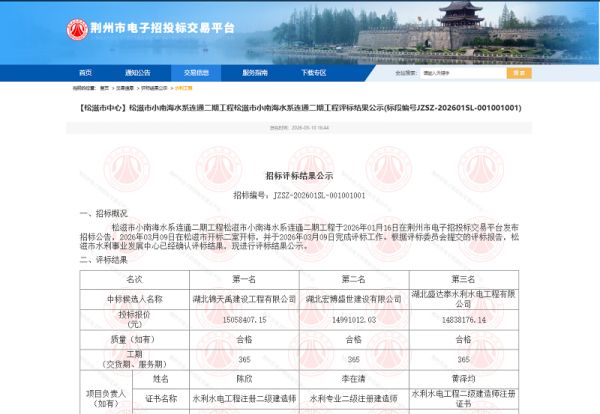 项目名称:松滋市小南海水系连通二期工程招标编码:JZSZ-202601SL-001001001招 标 人:松滋市水利事业发展中心相关网络截图:相关网络链接:松滋市小南海水系连通二期工程评标结果公示