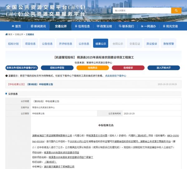 项目名称:桃源县2025年高标准农田建设项目工程施工(第八标段)招标编码:HNCD-202509AG-001804招 标 人:桃源县农业农村局相关网络截图:相关网络链接:桃源县2025年高标准农田建设项目工程施工中标结果公告