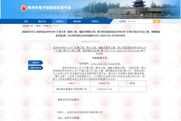项目名称:松滋市小南海水系连通二期工程招标编码:JZSZ-202601SL-001001001招 标 人:松滋市水利事业发展中心相关网络截图:相关网络链接:松滋市小南海水系连通二期工程评标结果公示