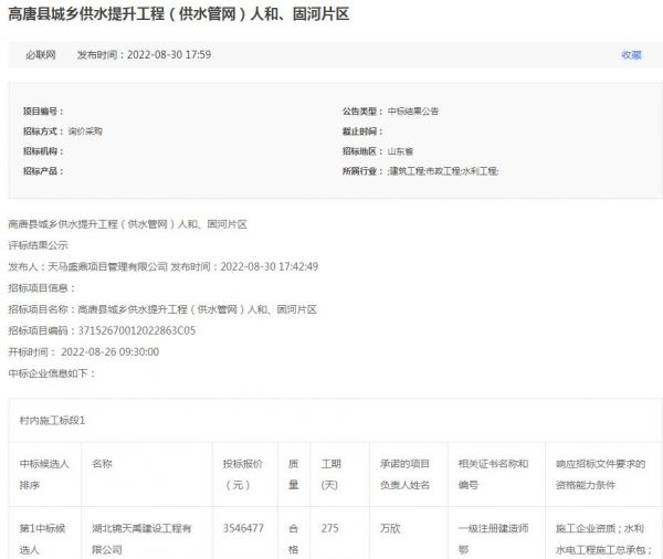 项目名称:高唐县城乡供水提升工程(供水管网)人和、固河片区招标编码:37152670012022863C05招标人: 高唐县水务工程有限公司相关网络截图:相关网络链接:高唐县城乡供水提升工程(供水管网)人和、固河片区