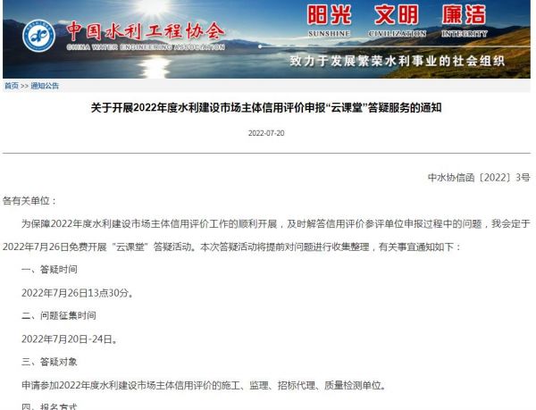 相关网络截图:相关网络链接:关于开展2022年度水利建设市场主体信用评价申报“云课堂”答疑服务的通知
