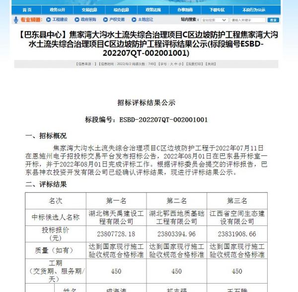 项目名称:焦家湾大沟水土流失综合治理项目C区边坡防护工程招标编码:ESBD-202207QT-002001001招标人:巴东县神农投资开发有限公司相关网络截图:相关网络链接:焦家湾大沟水土流失综合治理项目C区边坡防护工程