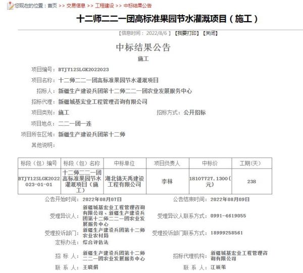 项目名称:十二师二二一团高标准果园节水灌溉项目(施工)招标编码:BTJY12SLGK2022023招标人:新疆生产建设兵团第十二师二二一团农业发展服务中心相关网络截图:相关网络链接:十二师二二一团高标准果园节水灌溉项目(施工)中标结果公告