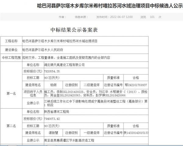 项目名称:哈巴河县萨尔塔木乡库尔米希村喀拉苏河水域治理项目招标编码:A3300000030001379001 招标人:哈巴河县萨尔塔木乡人民政府相关网络截图:相关网络链接:哈巴河县萨尔塔木乡库尔米希村喀拉苏河水域治理项目中标候选人