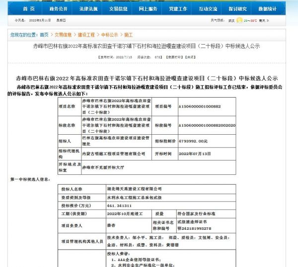 项目名称:赤峰市巴林右旗2022年高标准农田查干诺尔镇下石村和海拉逊嘎查建设项目(二十标段)招标编码:A1504000001000882 招标人:巴林右旗高标准农田建设项目建设管理处相关网络截图:相关网络