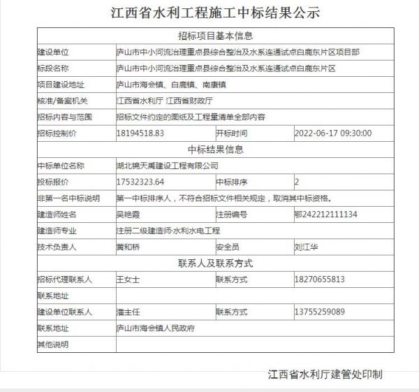 项目名称:庐山市中小河流治理重点县综合整治及水系连通试点白鹿东片区招标编码:\招标人:庐山市中小河流治理重点县综合整治及水系连通试点白鹿东片区项目部相关网络截图:相关网络链接:庐山市中小河流治理重点县综合整治及水系连通试点白鹿东片区