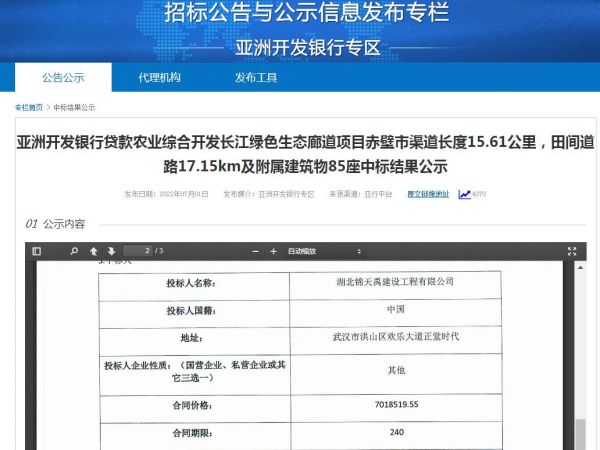 项目名称:亚洲开发银行贷款农业综合开发长江绿色生态廊道项目赤壁市渠道长度15.61公里,田间道路17.15km及附属建筑物85座招标编码:0701-21450