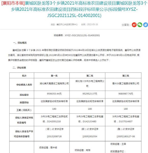 项目名称:东西湖区2021年五小农田水利建设(二期)项目施工(第二次)招标编码:202201121623082539招标人:武汉临空港经济技术开发区农业发展投资集团有限公司相关网络截图:相关网络链接:襄城区卧龙等 3 个乡镇 2021 年高