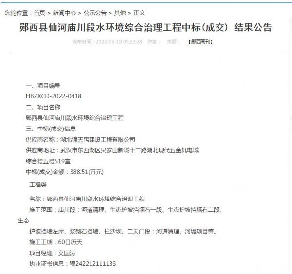 项目名称:郧西县仙河庙川段水环境综合治理工程招标编码:HBZXCD-2022-0418招标人:郧西县天源水务投资开发有限公司相关网络截图:相关网络链接:郧西县仙河庙川段水环境综合治理工程中标(成交) 结果公告