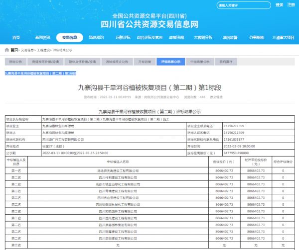 项目名称:九寨沟县干旱河谷植被恢复项目(第二期)第1标段招标编码:九寨沟工招〔2022〕4号招标人:九寨沟县林业和草原局相关网络截图:相关网络链接:九寨沟县干旱河谷植被恢复项目(第二期)第1标段评标结果公示