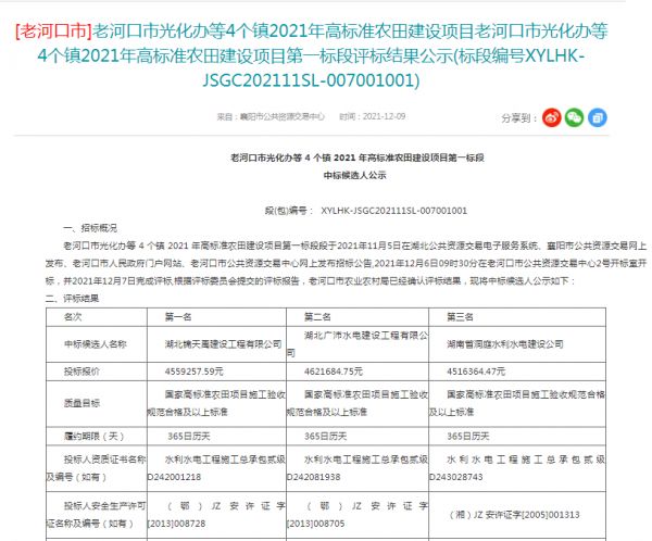 项目名称:老河口市光化办等4个镇2021年高标准农田建设项目第一标段招标编码:XYLHK-JSGC202111SL-007001001招标人:老河口市农业农村局相关网络截图:相关网络链接:老河口市光化办等4个镇2021年高标准农田建设项目第
