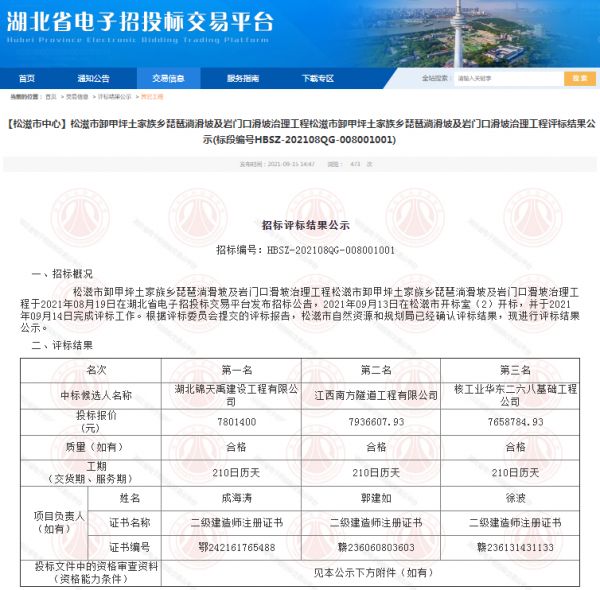 项目名称:松滋市卸甲坪土家族乡琵琶淌滑坡及岩门口滑坡治理工程招标编码:HBSZ-202108QG-008001001招标人:松滋市自然资源和规划局相关网络截图:相关网络链接:松滋市卸甲坪土家族乡琵琶淌滑坡及岩门口滑坡治理工程评标结果公示