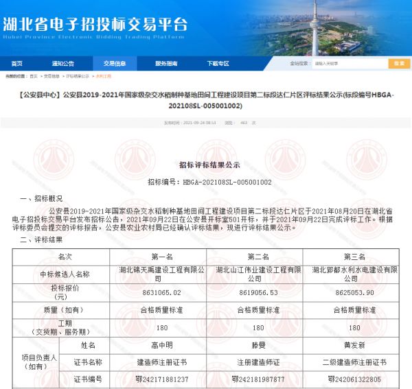 项目名称:公安县2019-2021年国家级杂交水稻制种基地田间工程建设项目第二标段达仁片区招标编码:HBGA-202108SL-005001002招标人:公安县农业农村局相关网络截图:相关网络链接:公安县2019-2021年国家级杂交水稻制