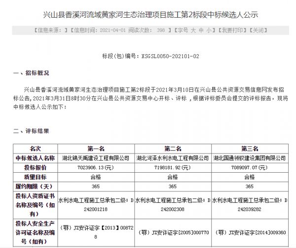 项目名称:郧西县金钱河上津段水生态修复工程(二期)招标编码:HBYX-202103SL-002001001招标人:郧西县天源水务投资开发有限公司相关网络截图:相关网络链接:郧西县金钱河上津段水生态修复工程(二期)评标结果公示
