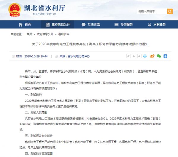 关于2020年度水利电力工程技术高级(副高)职务水平能力测试考试报名的通知相关网络链接:http://slt.hubei.gov.cn/fbjd/tzgg/202010/t20201029_2985164.shtml