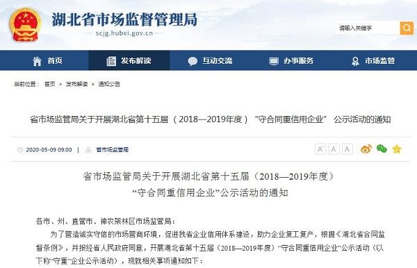 相关原文件:省市场监管局关于开展湖北省第十五届 (2018—2019年度)“守合同重信用企业” 公示活动的通知