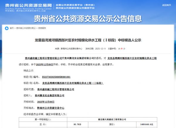 项目名称:龙里县湾滩河镇西部片区农村规模化供水工程(Ⅰ标段)招标编码:E52273020250005RO001001招 标 人:贵州腾龙实业集团有限公司相关网络截图:相关网络链接:龙里县湾滩河镇西部片区农村规模化供水工程(Ⅰ标段)中标候选人