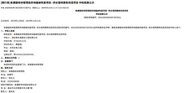 项目名称:阜康国有林管理局异地植被恢复项目--供水管网更新改造项目招标编码:E6523003905007387001招 标 人:阜康国有林管理局相关网络截图:相关网络链接:阜康国有林管理局异地植被恢复项目--供水管网更新改造项目中标结果公示