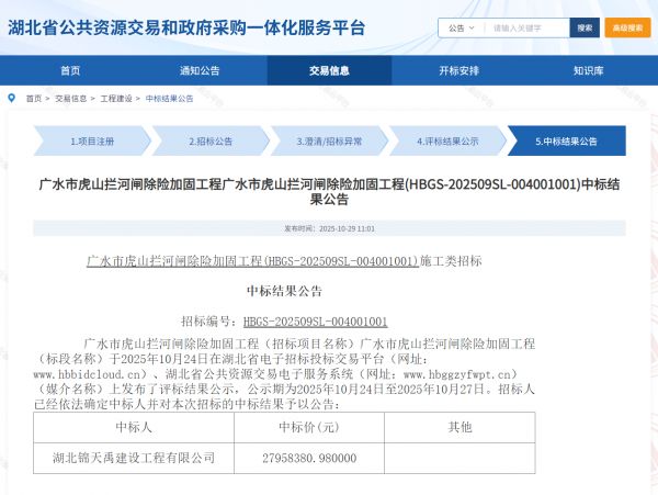 项目名称:广水市虎山拦河闸除险加固工程招标编码:HBGS-202509SL-004001001招 标 人:广水市水利和湖泊局相关网络截图:相关网络链接:广水市虎山拦河闸除险加固工程中标结果公告